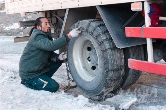 其美多吉在途中幫助社會(huì)車輛安裝防滑鏈(資料照片)。其美多吉是中國郵政甘孜縣分公司郵運(yùn)駕駛組的一名郵車司機(jī),往返在甘孜縣與德格縣之間。這段路程是四川省甘孜州綿延5866公里、平均海拔超過3500米的雪線郵路最危險(xiǎn)的一段。新華社發(fā)(周兵 攝)