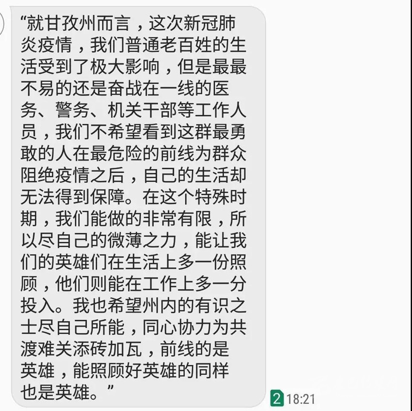 由于工作繁忙,陳永強(qiáng)并未出現(xiàn)在捐贈(zèng)現(xiàn)場(chǎng),通過(guò)短信他這樣說(shuō)道: