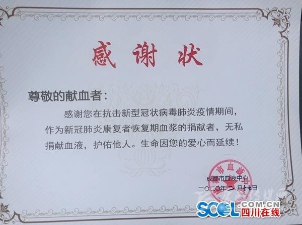 “出院的時候,我特地與我的主治醫(yī)生說,有相關(guān)的血液捐贈或者其他配合的需求請隨時聯(lián)系我!”35歲的捐獻者李某表示,這是我首次獻血,我是湖北武漢人,有親戚朋友在成都,當(dāng)作成都是第二故鄉(xiāng),我是1月22日到成都探親,23日下午發(fā)熱在成都市公共衛(wèi)生臨床醫(yī)療中心確診和治療,2月6日出院。在出院治療期間,李某表示,最難忘的就是每次醫(yī)生來查房,都會鼓勵我說,放心你一定會康復(fù)的,“我難忘成都這份恩情!”