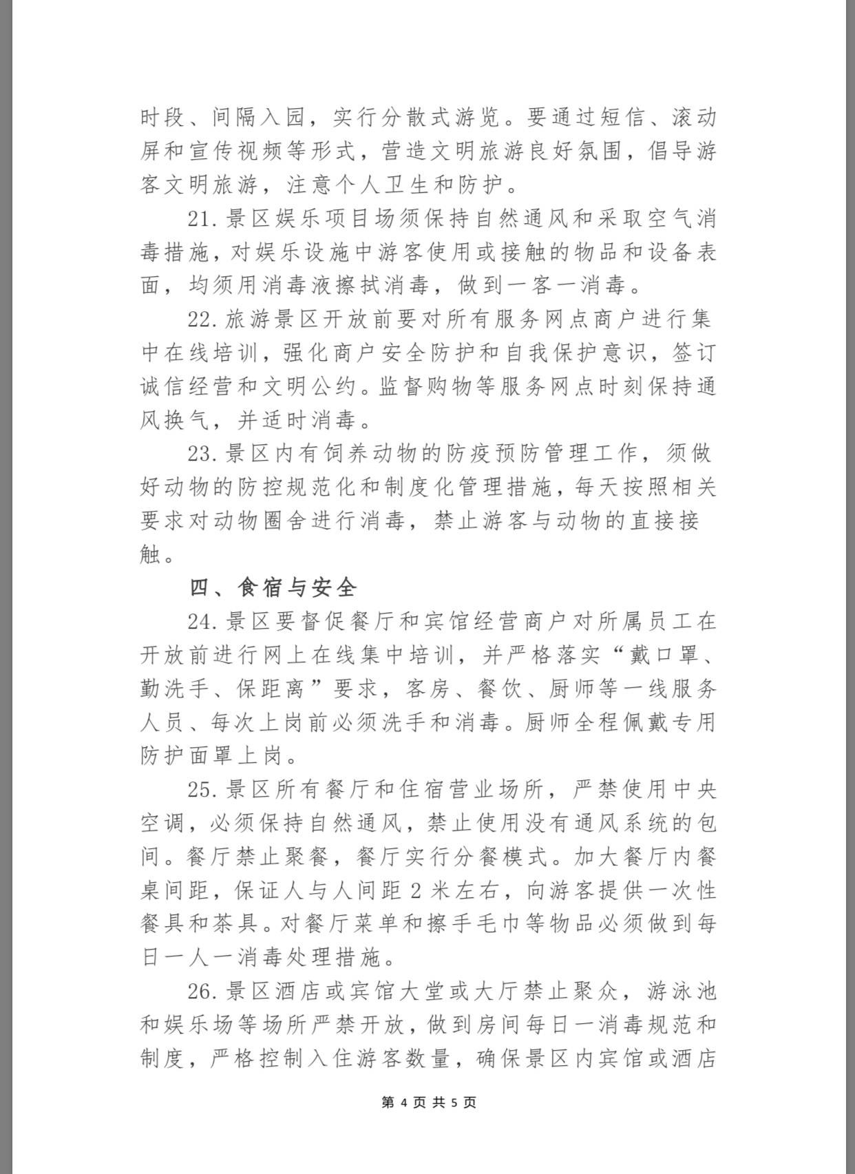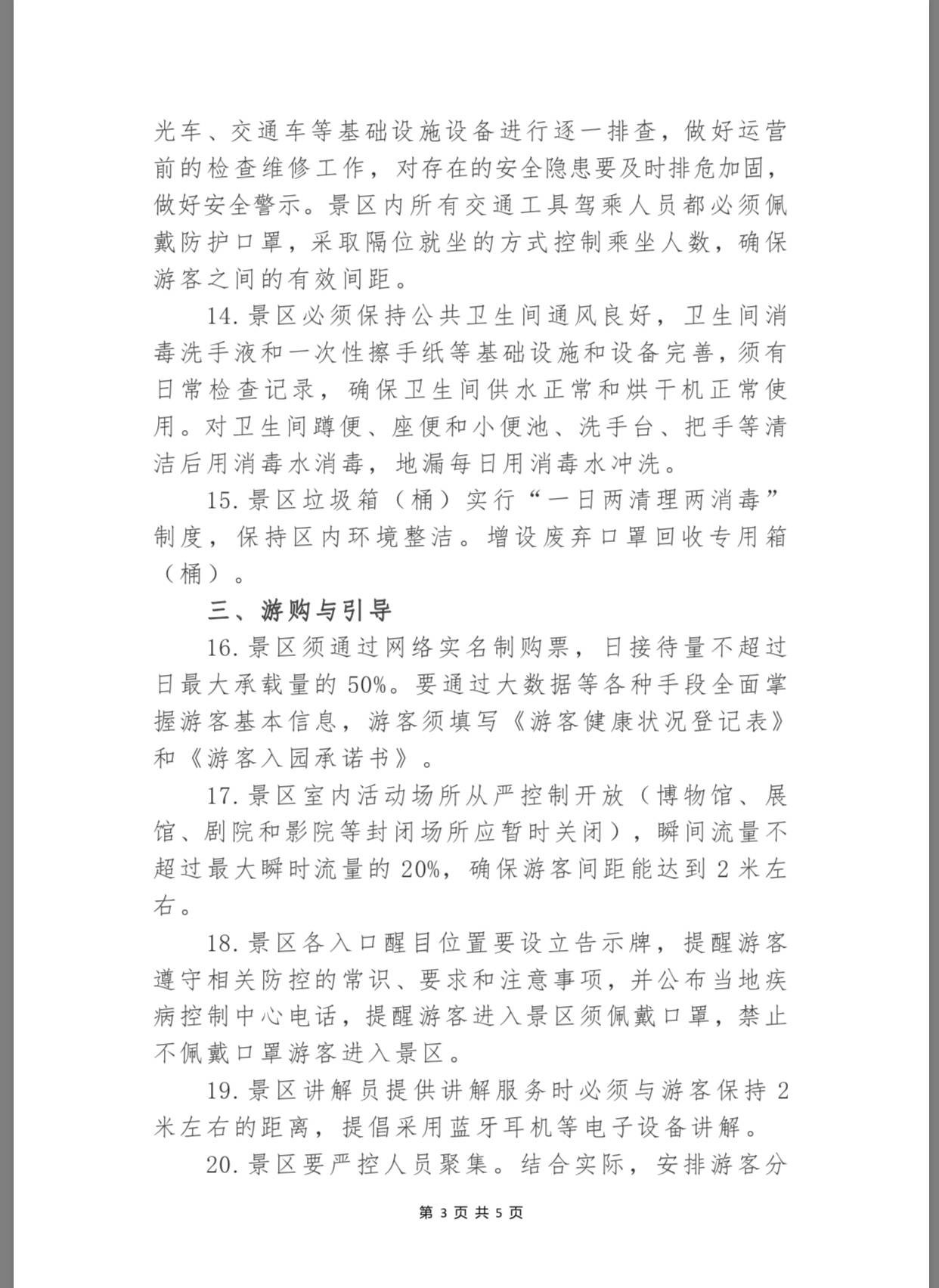 為保障景區(qū)安全有序恢復(fù)開放,景區(qū)游客服務(wù)中心和(志愿者或商業(yè))服務(wù)網(wǎng)點除放置免費中英文防治新冠肺炎的宣傳資料外,還要放置“本中心已消毒”告示,應(yīng)備有75%的酒精棉球或其它消毒液等免費供游客使用。同時,景區(qū)內(nèi)所有交通工具駕乘人員都必須佩戴防護口罩,采取隔位就坐的方式控制乘坐人數(shù),確保游客之間的有效間距,而垃圾箱(桶)則實行“一日兩清理兩消毒”制度,增設(shè)廢棄口罩回收專用箱(桶)。