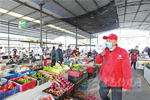 “喇叭哥”志愿服務(wù)很帶勁邱時春在農(nóng)貿(mào)市場用喇叭喊話,提醒大家戴好口罩。