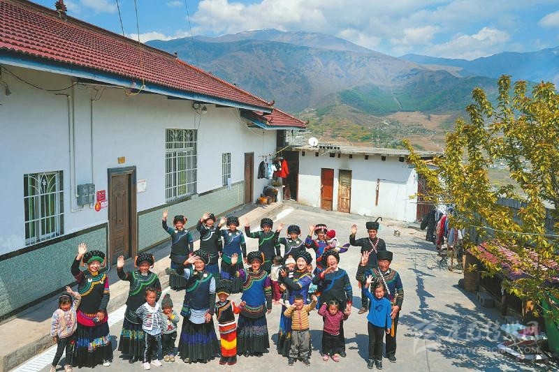 越西縣鐵西鄉(xiāng)阿支吾村,村民們?cè)谪毨赳R海大爾(右一)新居前合影。