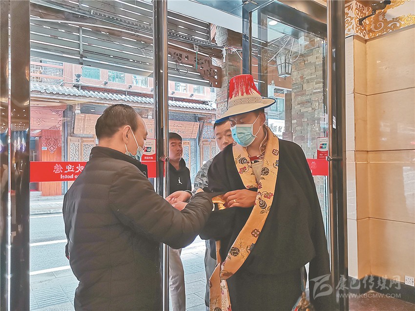 色達(dá)縣演出隊(duì)入住邦金麥朵酒店。每天,酒店安保人員多扎準(zhǔn)時(shí)出現(xiàn)在門口,提醒演職人員測(cè)量體溫、佩戴口罩?!拔沂蔷频甑牡谝魂P(guān)卡,拉姆是第二關(guān),我倆相互配合,表演節(jié)目的客人住得放心,演出的節(jié)目才會(huì)更加精彩?!蹦弥w溫槍,多扎一臉自豪地說。