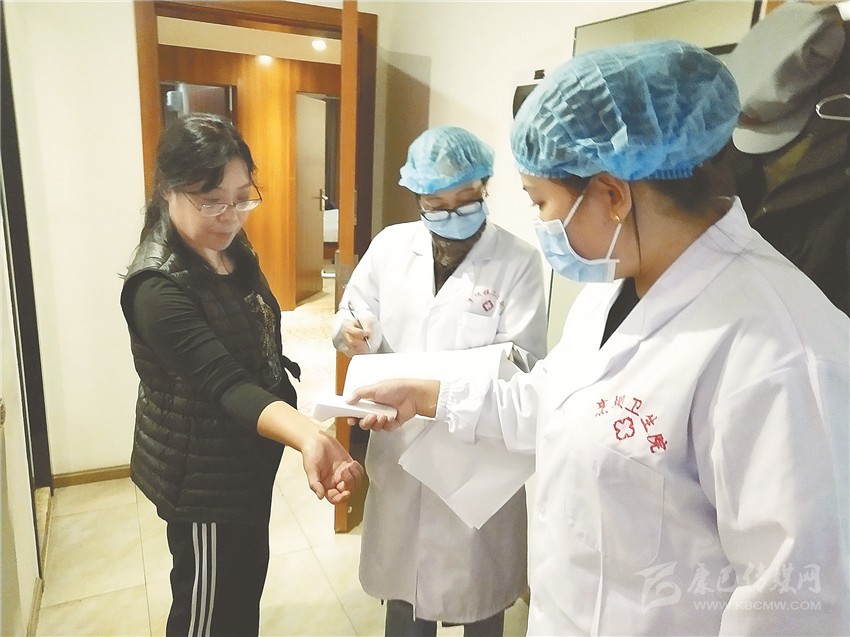 醫(yī)務(wù)人員到演職人員房間測(cè)量體溫。
