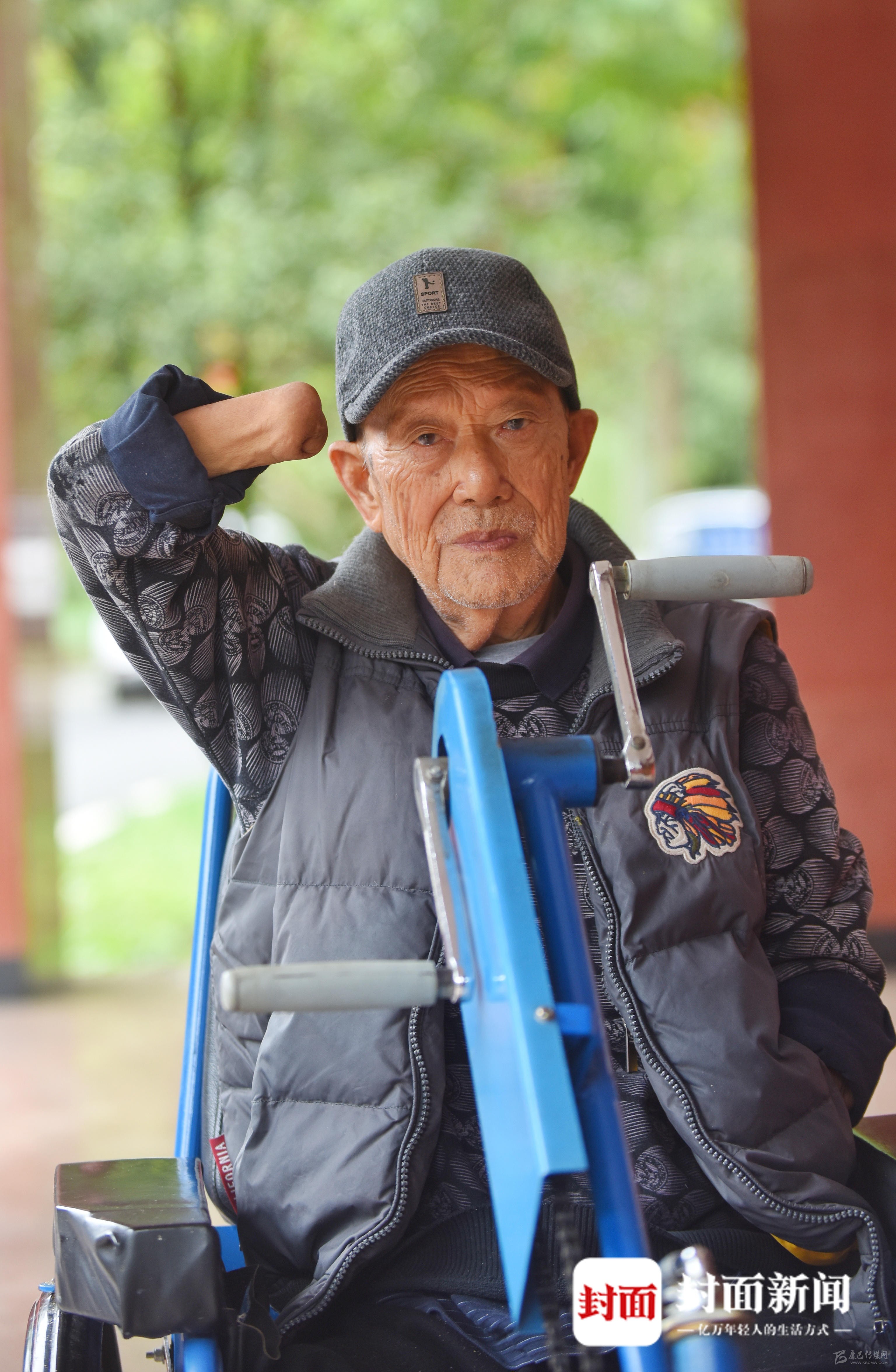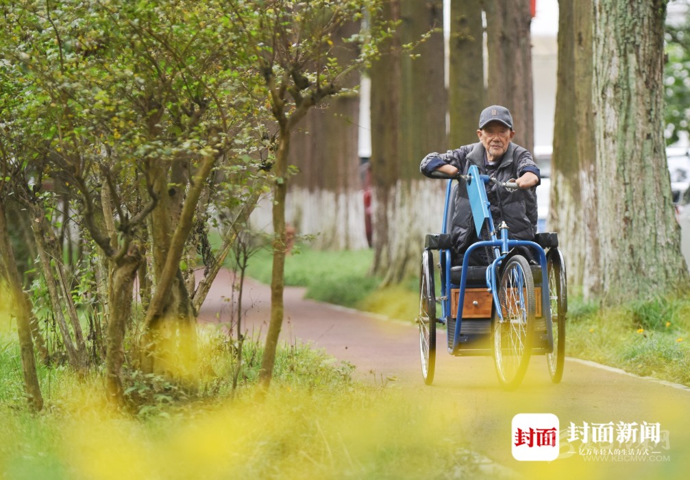 老人四肢殘缺,騎著特制的手搖三輪車,也能行動自如。距離老人被截肢已經(jīng)70年了,他早已學(xué)會獨立生活。