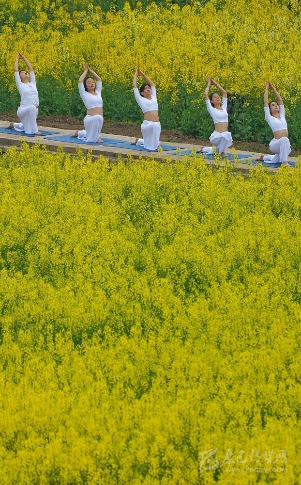 在南充市蓬安縣新園鄉(xiāng)踏坡梁村,來自省內外的游客在數(shù)千畝油菜地里練瑜伽、騎賽車、秀旗袍、放風箏。尹鋼 攝 (資料圖)