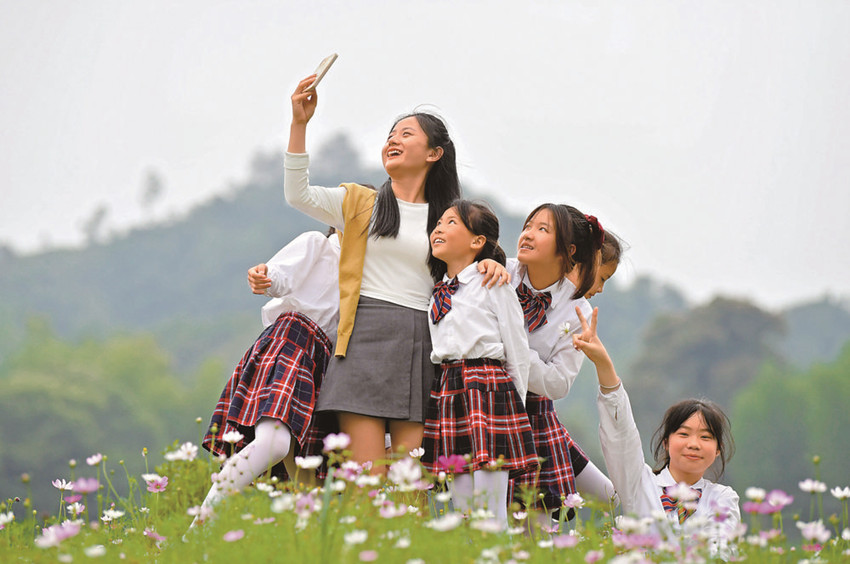 在江西省新余市分宜縣洞村鄉(xiāng),老師鐘琳珊(左二)帶著合唱團(tuán)的孩子在戶外練歌玩耍,合影留念(2022年5月25日攝)。 新華社 發(fā)
