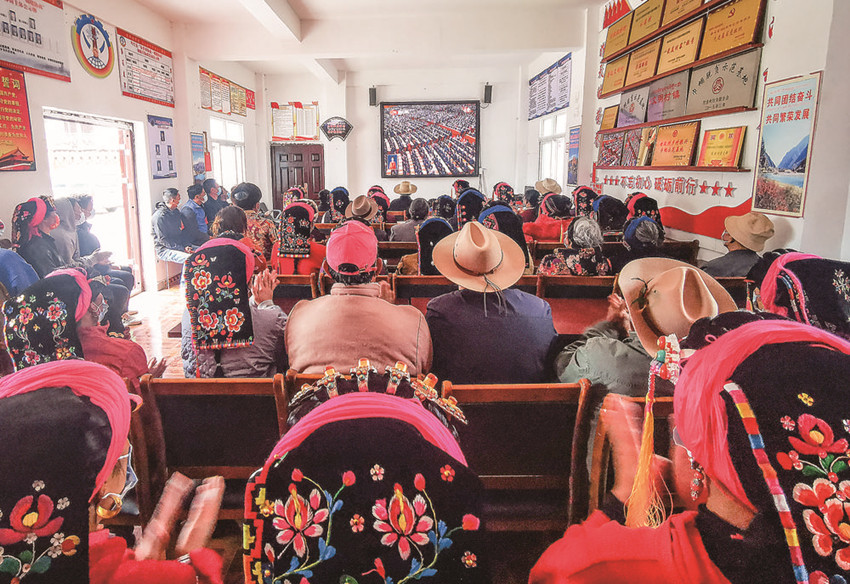 丹巴縣甲居鎮(zhèn)小巴旺村村民身著節(jié)日盛裝,集中收看黨的二十大開幕會(huì)。曹松 攝