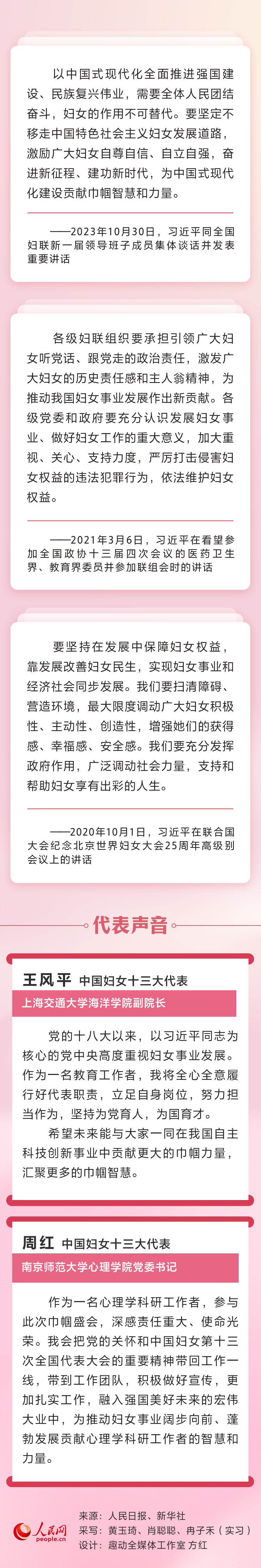 黨的十八大以來,以習(xí)近平同志為核心的黨中央從黨和國(guó)家事業(yè)發(fā)展全局出發(fā),高度重視和積極推進(jìn)婦女工作,加強(qiáng)黨對(duì)婦女工作的領(lǐng)導(dǎo),堅(jiān)持中國(guó)特色社會(huì)主義婦女發(fā)展道路,部署婦聯(lián)改革任務(wù),發(fā)揮婦女在各個(gè)方面的積極作用,推動(dòng)我國(guó)婦女事業(yè)取得歷史性成就。人民網(wǎng)帶您重溫習(xí)近平總書記重要論述并邀請(qǐng)中國(guó)婦女十三大代表解讀。