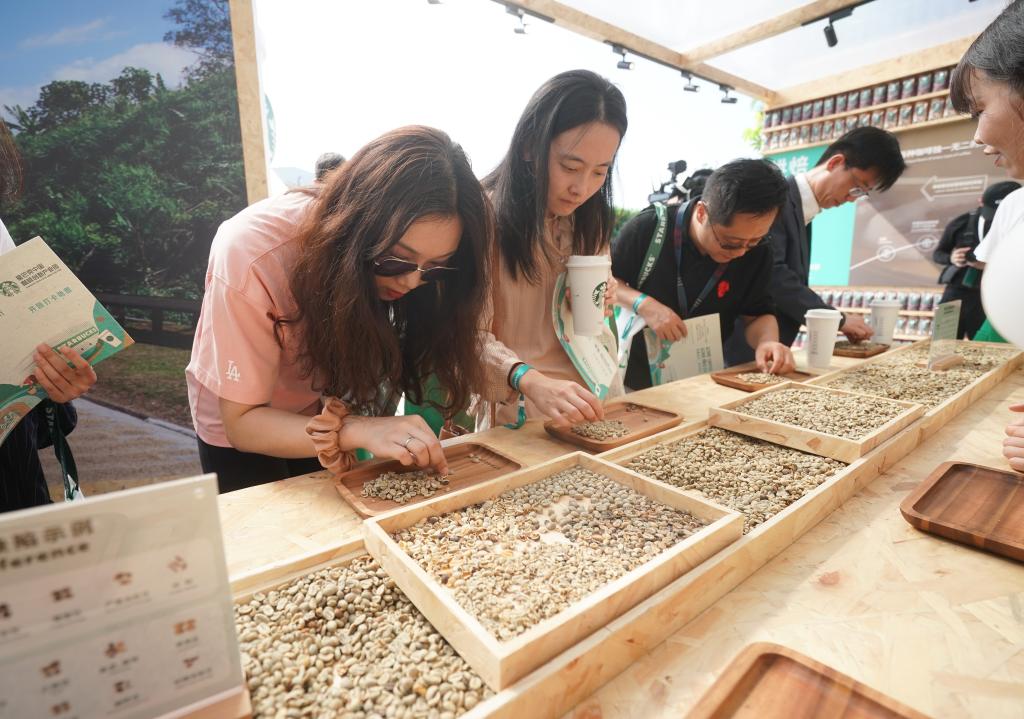 9月19日,在星巴克中國咖啡創(chuàng)新產業(yè)園開園儀式現(xiàn)場,來賓在體驗挑揀咖啡生豆。當日,星巴克中國咖啡創(chuàng)新產業(yè)園在江蘇昆山落成投產。