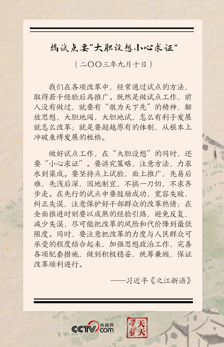 早在浙江工作期間,習(xí)近平就曾在《之江新語(yǔ)》中對(duì)改革試點(diǎn)工作進(jìn)行過(guò)較為系統(tǒng)和詳細(xì)的論述。他在《搞試點(diǎn)要“大膽設(shè)想小心求證”》一文中寫道:既然是做試點(diǎn)工作,前人沒(méi)有做過(guò),就要有“敢為天下先”的精神,解放思想,大膽地闖,大膽地試,怎么有利于發(fā)展就怎么改革;就是要超越原有的體制,從根本上沖破束縛發(fā)展的桎梏。