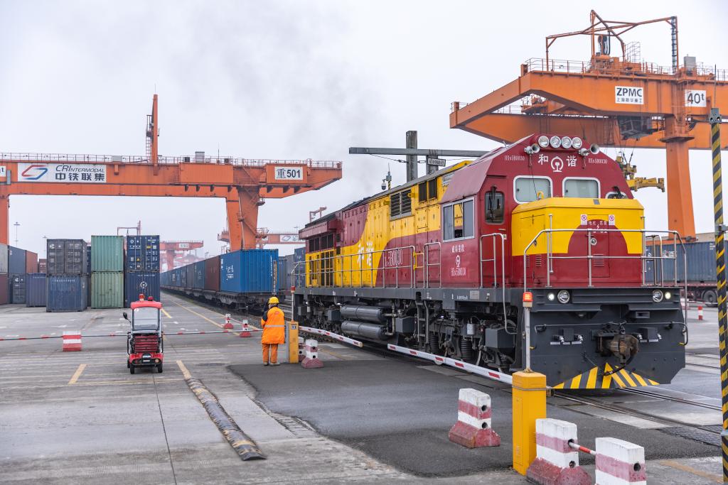 ??3月7日,一列滿載機械設備、整車及零部件等貨物的中歐班列在重慶團結村中心站等候發(fā)車。新華社記者 黃偉 攝
