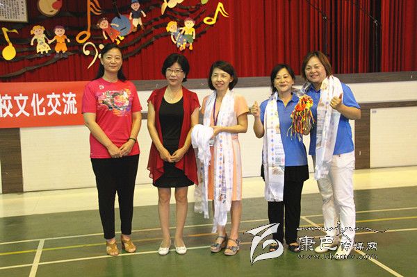 ▲巴塘縣委常委、宣傳部長(zhǎng)張平樹,巴塘縣政府副縣長(zhǎng)王文英向臺(tái)中市北區(qū)太平小學(xué)回贈(zèng)哈達(dá)和吉祥結(jié)。