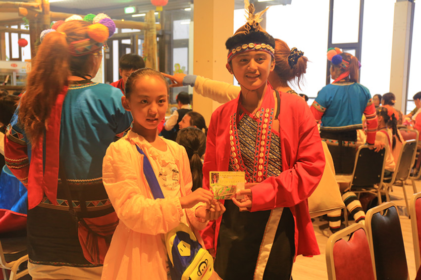 巴塘小朋友在臺上跳著歡快的《激情弦子》,臺下臺灣師生及學生家長立即打起節(jié)拍,把活動推向高潮。兩岸小朋友在午餐時間互相結(jié)對子,并通過贈送紀念品,互留電話號碼的方式將友情延續(xù)下去。在幾天的交流活動中,巴塘天籟童聲合唱團的孩子們也受到了臺灣當?shù)貙W生家長們的熱烈歡迎。在每場演出的現(xiàn)場,隨處可見拿著相機、攝像機記錄交流活動全過程的當?shù)貙W生家長。在巴塘孩子們的表演間隙,幾位熱心的當?shù)貙W生家長們立即給巴塘孩子送上礦泉水,詢問他們“累不累,熱不熱”。一位家長告訴筆者:“我是學生家長,當我看到巴塘小朋友在如此炎熱的天氣下,穿著華麗厚實的民族服飾演出,我的眼睛里全是淚花,真的特別感動??吹竭@些孩子們天真的笑容,聽著他們嘹亮的歌聲,我和其他家長一樣都被震撼了。我還專門拍了視頻打算回去給家人看,我希望他們在臺灣的這幾天能夠開心快樂,也希望他們以后還能來臺灣做更多交流。”