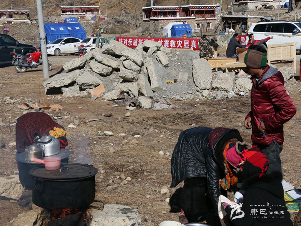 走進(jìn)八美鎮(zhèn)重災(zāi)區(qū)中古村災(zāi)民安置區(qū),第一眼就能看見(jiàn)戴著紅袖章的兩個(gè)村民正圍著兩個(gè)大灶轉(zhuǎn)來(lái)轉(zhuǎn)去忙個(gè)不停。村民巴青老人說(shuō):“災(zāi)后,我們隊(duì)的村民都集中安置在這里,為方便受災(zāi)群眾和前來(lái)幫忙的干部都能喝上一口熱茶,我們幾個(gè)村民臨時(shí)搭建了兩個(gè)‘三鍋莊’灶臺(tái),用來(lái)燒清茶和開(kāi)水,因?yàn)槲覀冎烙行└刹苛?xí)慣喝白開(kāi)水,就特意準(zhǔn)備了一個(gè)燒白開(kāi)水的鍋。”他指著正在搶修房屋的黨員服務(wù)隊(duì)說(shuō):“地震發(fā)生到現(xiàn)在,很多領(lǐng)導(dǎo)來(lái)看望我們,很多干部到村上幫助搶修房屋、運(yùn)送物資,這么冷的天,他們一直不停地在幫我們做事情,很辛苦!我們不能光等著干部們來(lái)給我們做事情,我今年68歲,雖然做不了大的事,但是給他們燒茶遞水是沒(méi)有問(wèn)題的。”