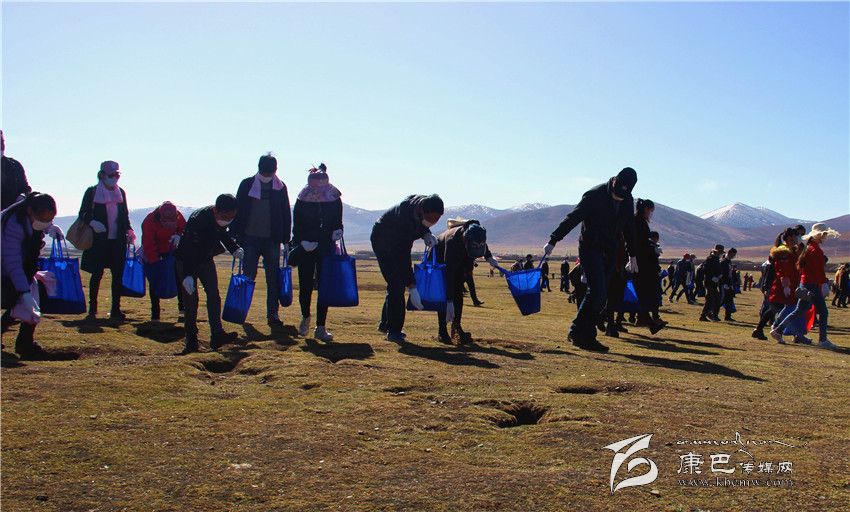5月11日,距石渠縣城約5公里處的草原上人聲鼎沸,格外熱鬧。一大早,來自各單位的300余名黨員干部便聚集到了這里,身穿紅背心的青年志愿者們正忙著為大家分發(fā)口罩、手套等勞動(dòng)物品。而在人群最前端,一輛拖拉機(jī)滿載著一車類似飼料的東西,七八個(gè)人正有條不紊地將“飼料”卸車并分裝進(jìn)數(shù)百個(gè)藍(lán)色環(huán)保袋中。