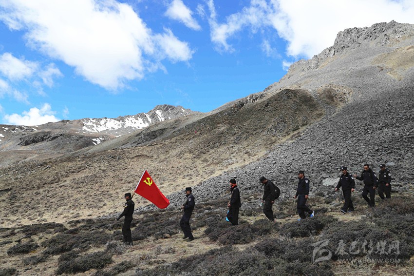 為確保蟲(chóng)草采挖期間的社會(huì)治安穩(wěn)定,縣公安局抽調(diào)精干力量,前往哈幾山、莫庫(kù)溝等多個(gè)蟲(chóng)草采挖點(diǎn)開(kāi)展巡山維穩(wěn)。這次和我們一起開(kāi)展常規(guī)巡邏的共有8名公安干警。降初是本地人,1.78米的個(gè)子,一路上,他高舉黨旗、步履矯健、勇往直前,成為我們大家的“領(lǐng)路人”,大家經(jīng)常和他開(kāi)玩笑說(shuō):“跟著黨(旗)走永遠(yuǎn)不迷路”。