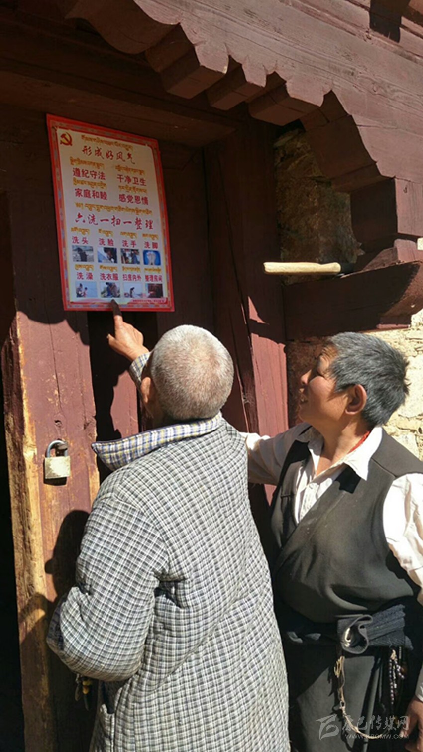 本網(wǎng)訊(扎西曲批 縣委中心報(bào)道組 葉強(qiáng)平 文/圖)11月9日,理塘縣甲洼鎮(zhèn)俄丁村老黨員格絨拉姆指著村民家門上掛的“六洗一掃一整理”紅牌,再次向村民講解宣傳相關(guān)要求,引導(dǎo)貧困群眾養(yǎng)成好習(xí)慣形成好風(fēng)氣。