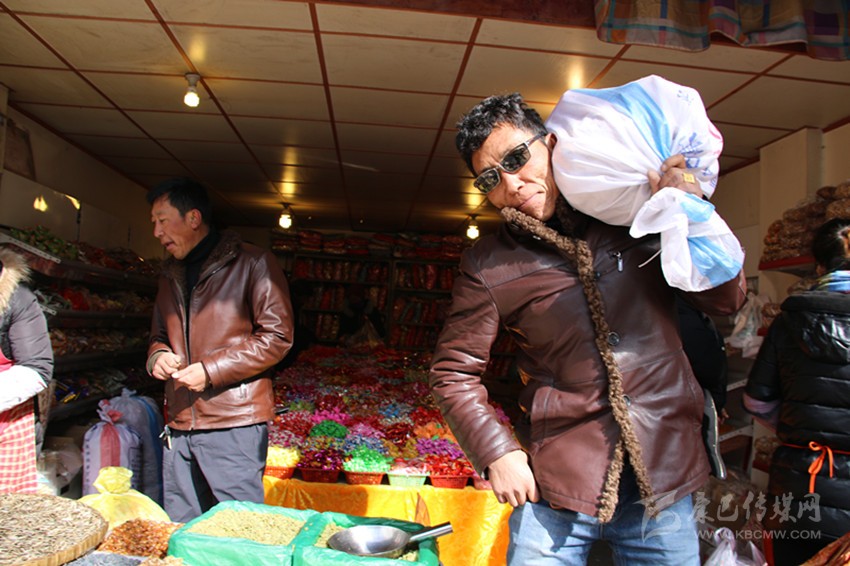 走進郭達橋重康糖果店,洛讓說:“多買點糖果糕點,娃娃老婆喜歡?!比缓笳諉吸c貨:花生10斤、瓜子5斤、葡萄干5斤、水果糖5斤、軟糖5斤、炒米糖10斤……一下就指點了八九種糖果糕點。看到了這樣的生意,老板樂開了花。與洛讓大包大攬的氣派不同,長期經(jīng)商的扎西老練地詢價:“老板,我們買這么多,要優(yōu)惠喲?!币环憙r還價之后,洛讓和扎西買了十種糖果,用去1066元,裝滿整整兩編織袋。洛讓把糖果過扛在肩上,對筆者說:“你來試一下,有點分量,你別說,辦年貨也是一種體力活喲?!?/p>