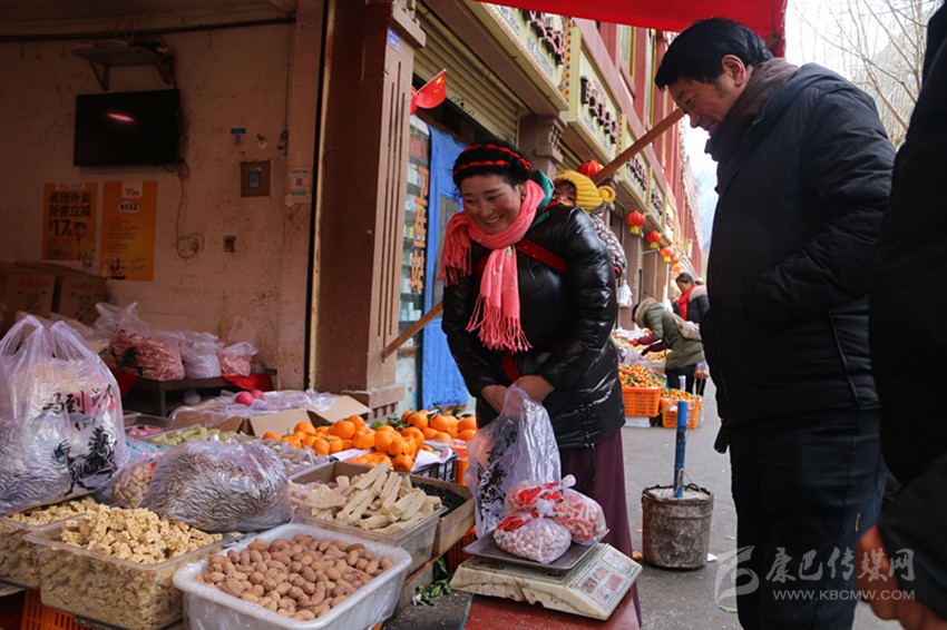 在離李全的鋪面十幾米的地方,副食商販王大姐正忙著給顧客羅繼祥稱雞蛋,羅繼祥是“老康定人”,他說(shuō):“以前過(guò)年都是自己在家里炒花生、炸果子,現(xiàn)在市場(chǎng)上啥子都有,方便多了,出門(mén)就能夠買(mǎi)到,到市場(chǎng)上和大家一起購(gòu)年貨,熱鬧、喜慶,有年味兒。”