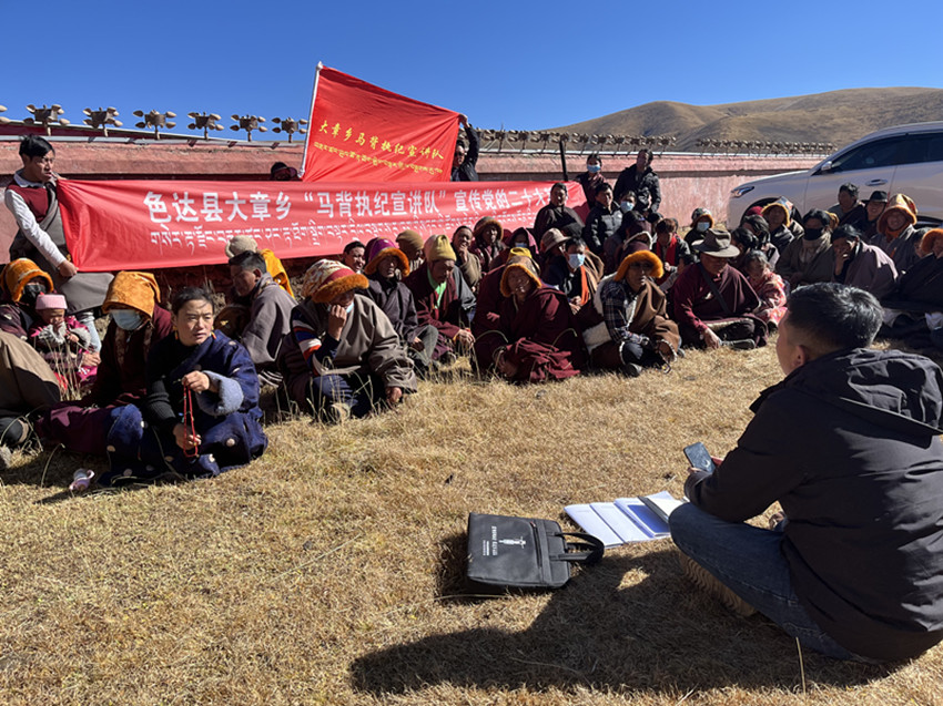 “針對色達(dá)高寒偏遠(yuǎn)、地廣人稀,牧區(qū)群眾生活居住較分散的情況,我們調(diào)配縣鄉(xiāng)村三級紀(jì)檢監(jiān)察力量,逐步組建起精通藏漢雙語、熟悉紀(jì)法知識、擅長群眾工作的馬背執(zhí)紀(jì)宣講隊,把黨的聲音傳遞到云端藏寨、天邊牧場?!鄙_(dá)縣紀(jì)委書記、監(jiān)委主任陳玉龍介紹,黨的二十大以來,宣講隊已開展宣講活動20余場次,推動為群眾辦實(shí)事10余件,解決困難訴求20件。