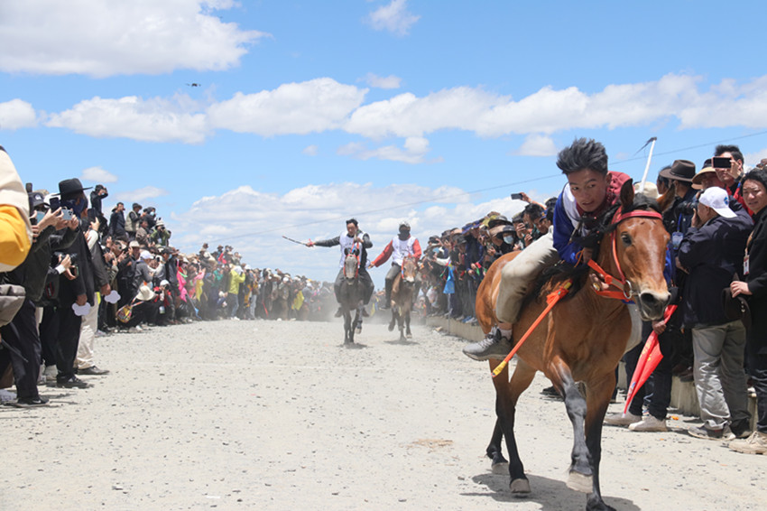 雪山潔白、青稞碧綠,雪白的貢嘎海棠搖曳在枝頭,目之所及,皆是風(fēng)景。騎手騎著自己心愛的馬兒,一個(gè)個(gè)英姿颯爽、神采飛揚(yáng)。隨著發(fā)令員的口號響起,駿馬像離弦的箭一樣飛奔出去,騎手們?nèi)笺T足了勁,勢必要在比賽中拔得頭籌。賽道上的駿馬你追我趕,賽道邊慕名前來的游客和周邊村民吶喊加油,跑出了甘孜兒女奮發(fā)向上、積極進(jìn)取的精神風(fēng)貌。