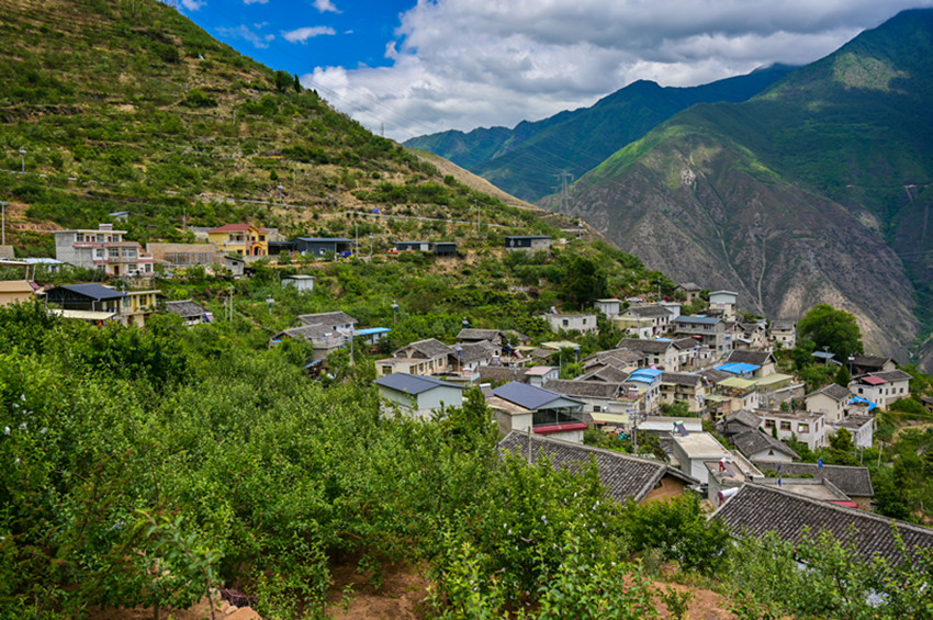 仲夏時節(jié),漫步在藍天白云下的黃草坪村,一個個雞蛋大小的蘋果、枇杷掛滿枝頭,撲面而來的果香味沁人心田。放眼望去,山谷間一團團云霧纏繞在大山峭壁間,山腳下,大渡河猶如一條青色的綢緞,歡騰的河水正述說如今黃草坪村的幸福生活。
