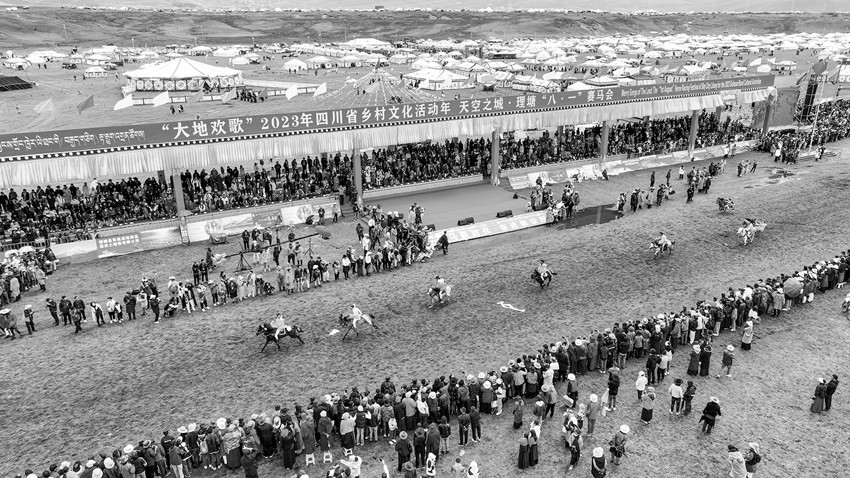 “中國(guó)藏族賽馬文化之鄉(xiāng)”“理塘八一傳統(tǒng)賽馬會(huì)”是四川涉藏州縣規(guī)模最大的賽馬會(huì),賽馬傳統(tǒng)延續(xù)長(zhǎng)達(dá)400余年?!霸缇吐犝f過馬背上的理塘,今天終于親眼所見,實(shí)在不虛此行。草原追風(fēng),策馬飛奔,蹄聲如雷,震徹山野,這是多么壯美的理塘萬(wàn)馬奔騰圖啊!多想遠(yuǎn)離城市的喧囂,策馬揚(yáng)鞭,馳騁草原,豪邁瀟灑,勇往直前。以后每一年的理塘賽馬活動(dòng),我一定會(huì)帶上家人再來這里,因?yàn)槔硖?,可謂是心靈棲息的地方?!痹凇按蟮貧g歌”2023年四川省鄉(xiāng)村文化活動(dòng)年——天空之城·理塘“八·一”賽馬會(huì)上,來自北京的游客石磊被當(dāng)?shù)刭愸R文化吸引,和朋友玩得不亦樂乎。