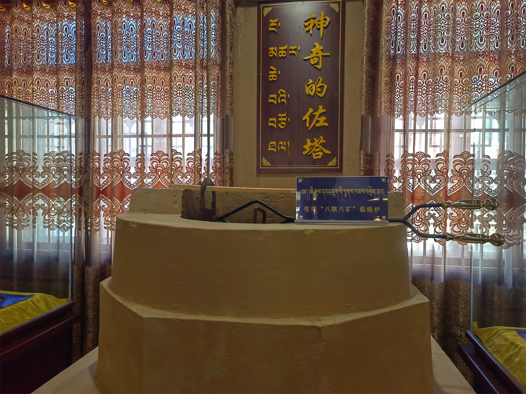 “這里是配制佐塔技藝的展示區(qū),中間黑色的粉末是已做好的成品,而周邊的‘八鐵八礦’就是做佐塔所需要的成分。整個(gè)炮制過程需要40余天、20多道工序,而且是24小時(shí)輪流換班,才能達(dá)到最佳”……德格縣藏醫(yī)院(藏醫(yī)藥研究所)講解員珠措邊走邊說。