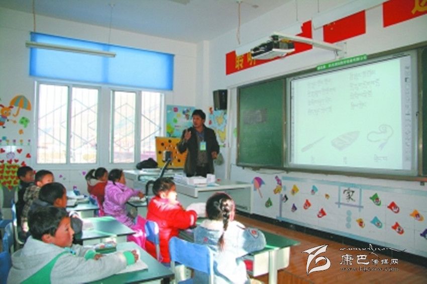 爐霍縣仁達鄉(xiāng)中心校教師正在利用多媒體教學(xué)。 李益眾 攝