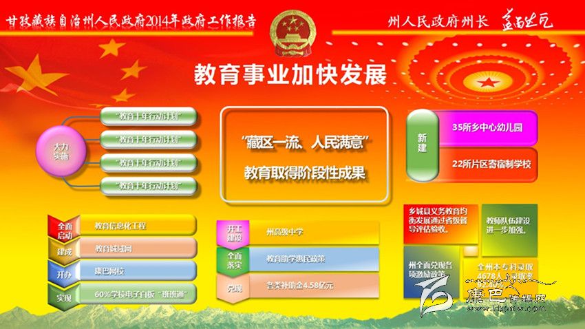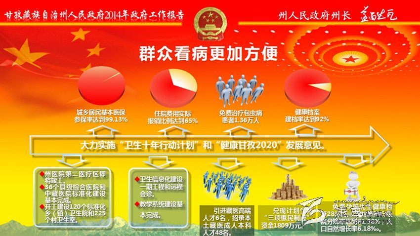 加大民生投入,全年民生支出139億元。全州城鎮(zhèn)新增就業(yè)7400人,城鄉(xiāng)低保實現(xiàn)應(yīng)保盡保;在全省民族地區(qū)率先實施醫(yī)療保險制度城鄉(xiāng)統(tǒng)籌,異地就醫(yī)即時結(jié)算全面啟動;在全省率先出臺大病醫(yī)療保險規(guī)定。教育事業(yè)加快發(fā)展。新建35所鄉(xiāng)中心幼兒園、22所片區(qū)寄宿制學(xué)校,州高級中學(xué)開工建設(shè)。全面落實教育助學(xué)惠民政策,兌現(xiàn)各類補助金4.58億元。城鄉(xiāng)居民基本醫(yī)保參保率達到99.13%,健康檔案建檔率達到92%;開工建設(shè)120個標準化鄉(xiāng)(鎮(zhèn))衛(wèi)生院和225個村衛(wèi)生室;衛(wèi)生信息化建設(shè)一期工程和遠程會診、教學(xué)系統(tǒng)建設(shè)基本完成;兌現(xiàn)計劃生育“三項惠民制度”資金1809萬元。群眾文化生活日益豐富。建成縣“兩館”12個;開工建設(shè)州民族體育館、州農(nóng)牧民演藝培訓(xùn)中心和14個縣級全民健身中心,建成農(nóng)民體育健身工程739個;開展 “送文化下鄉(xiāng)”近千場;康巴文化研究院“四大工程”全面啟動。深入實施“百千萬康巴英才工程”,人才科技工作扎實有效。扶貧移民工作成效明顯。完成1360個貧困村、19.91萬扶貧對象立卡建檔工作;實施整村推進63個、連片開發(fā)項目4個、彝家新寨(村)17個、索改橋23座,易地扶貧搬遷9850人,2.65萬群眾生產(chǎn)生活條件得到改善。