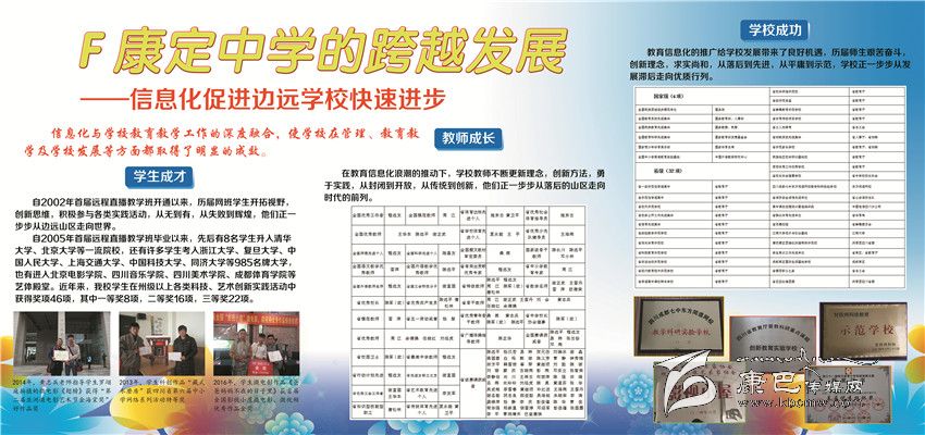 2002年以來(lái)康定中學(xué)立足民族地區(qū)教育實(shí)際,依托成都七中優(yōu)質(zhì)教育,先后開(kāi)通成都七中高中直播班、初中錄播班,建成初中遠(yuǎn)程直錄播教學(xué)AB平臺(tái),實(shí)現(xiàn)了與國(guó)內(nèi)名校共享優(yōu)質(zhì)教學(xué)資源的目標(biāo),將網(wǎng)課教學(xué)打造成學(xué)校教育品牌。經(jīng)過(guò)近5000名師生員工的不懈努力,2013年來(lái),康定中學(xué)連續(xù)4年高考硬上本科人數(shù)突破200人大關(guān)。先后有8名學(xué)生被北京大學(xué)和清華大學(xué)錄取。中考綜合評(píng)比連續(xù)9年保持全州第一。