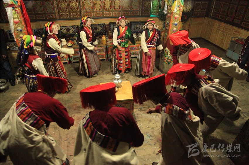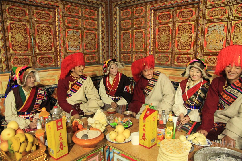 一家人穿上節(jié)日盛裝,按輩序就座。主婦手捧吉祥斗恭恭敬敬地走到長(zhǎng)輩跟前說“扎西德勒”,對(duì)方抓幾粒麥子邊向上撒邊祝福說:“扎西德勒!美滿幸福,祝主婦身體健康,預(yù)祝明年大家仍如此團(tuán)聚歡慶?!痹僮ヒ稽c(diǎn)切瑪送進(jìn)嘴里。家庭儀式后,家中兩人一個(gè)拿青稞酒、銀酒碗,一個(gè)手捧切瑪,到左鄰右舍、親朋好友家拜年,敬獻(xiàn)切瑪、青稞酒,互相祝福。
