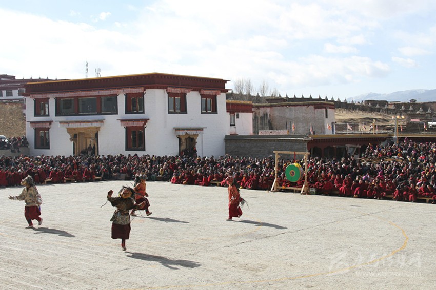 2月25日,是藏歷的12月29日,理塘縣長(zhǎng)青春科爾寺舉行了盛大的“古多”儀軌活動(dòng)。僧人在寺廟廣場(chǎng)表演“羌姆”,各區(qū)鄉(xiāng)鎮(zhèn)農(nóng)牧民群眾近萬(wàn)人匯聚于此,觀看表演?!扒寄贰币鉃樘瘢遣貍鞣鸾讨腥谧诮绦?、藝術(shù)性為一體的法舞儀式,本地藏族群眾又稱其為“巴羌”,即“面具法舞”,寄寓了人們辭舊迎新、禳災(zāi)祈福的美好愿望。