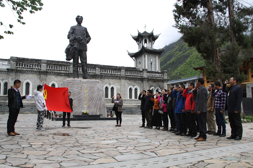本網(wǎng)訊 (本網(wǎng)記者 秦松 攝影報(bào)道)日前,甘孜日?qǐng)?bào)社全體黨員與群眾工作全覆蓋結(jié)對(duì)共建共創(chuàng)的海螺溝燕子溝鎮(zhèn)的躍進(jìn)坪村支部、南門關(guān)村支部、麻柳林村支部、喇嘛溝村支部的黨員,懷著崇敬的心情來(lái)到磨西長(zhǎng)征紀(jì)念館毛主席塑像前,舉行緬懷革命先烈、重溫入黨誓詞活動(dòng)?;顒?dòng)中,黨員們還與共建共創(chuàng)支部黨員進(jìn)行了座談。圖為宣誓活動(dòng)現(xiàn)場(chǎng)。