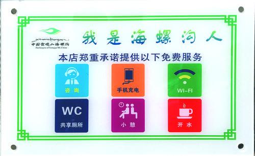 “我們長征大酒店在提高服務(wù)質(zhì)量的同時也掛了這個牌子,我們承諾為客人提供免費的開水、充電、共享廁所等服務(wù),讓客人對海螺溝有一個美好的印象,在海螺溝過的開心愉快?!遍L征大酒店負責人楊德黎說。
