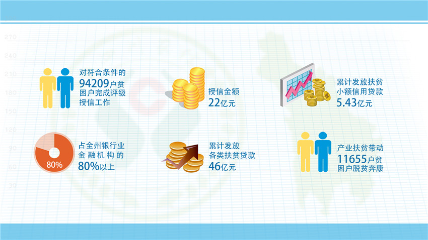 ——強(qiáng)化信貸扶持。緊緊圍繞全州脫貧退出總體目標(biāo),打破各縣劃分片區(qū)、劃分任務(wù)的局面,使脫貧攻堅(jiān)工作從行政手段調(diào)整到市場(chǎng)競(jìng)爭(zhēng)和民生工程兼顧,堅(jiān)持“三個(gè)一百”——即百分百對(duì)符合條件的建檔立卡貧困戶(hù)進(jìn)行評(píng)級(jí)授信,授信面達(dá)到100%;百分百滿(mǎn)足貧困戶(hù)有效信貸需求;百分百滿(mǎn)足產(chǎn)業(yè)帶動(dòng)扶貧項(xiàng)目有效信貸需求,加強(qiáng)與18個(gè)縣黨委政府的溝通對(duì)接,瞄準(zhǔn)每個(gè)縣的地方特產(chǎn)產(chǎn)業(yè),因地制宜,為每個(gè)縣量身打造“一縣一策”的金融服務(wù)方案,累計(jì)發(fā)放各類(lèi)產(chǎn)業(yè)、項(xiàng)目帶動(dòng)扶貧貸款20.69億元。