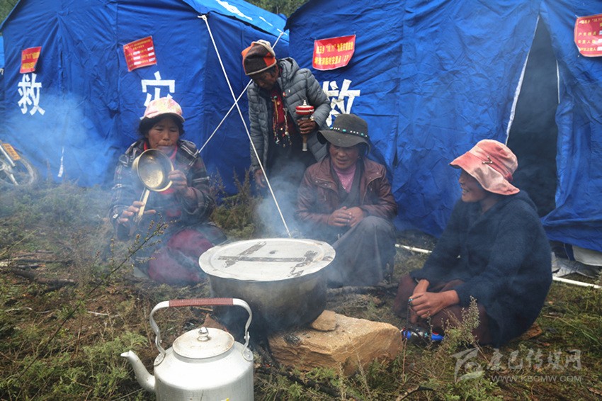 曲珍、曲西和幾個伙伴正在燒著開水?!斑@是到安置點后我第一次生火。前兩天吃干糧喝礦泉水,讓喝慣了酥油茶的我們很不適應(yīng)。”曲珍說。