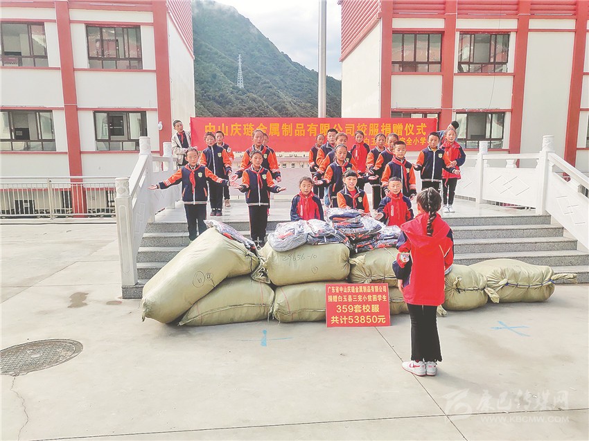 本網(wǎng)訊 9月8日上午,廣東省中山慶璉金屬制品有限公司向白玉縣第三完全小學(xué)捐贈(zèng)了359套校服,總價(jià)值約53850元。圖為學(xué)生代表現(xiàn)場(chǎng)演唱歌曲《聽我說 謝謝你》,表達(dá)對(duì)愛心企業(yè)的感謝。