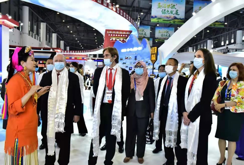 在第十八屆中國(guó)西部國(guó)際博覽會(huì)上向外賓推介甘孜。