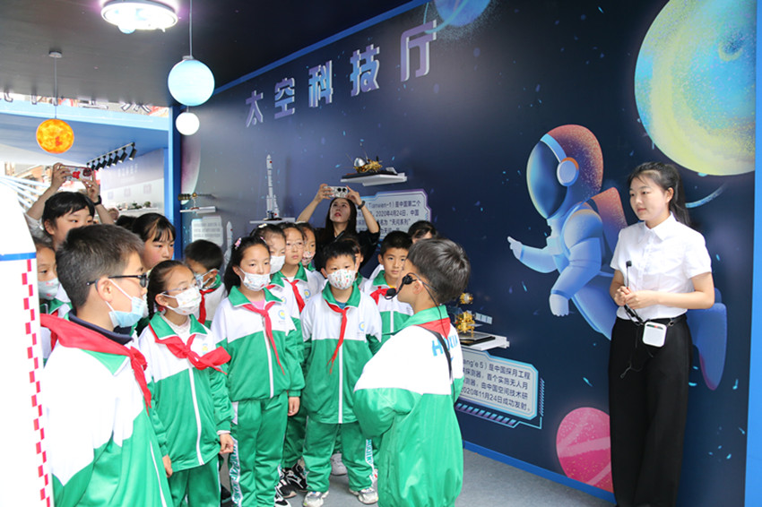 “航天夢是中國夢、華夏夢,神舟十六號載人飛船發(fā)射成功并進(jìn)入預(yù)定軌道。古人仰望星空,幻想上天攬?jiān)碌膲粝耄谝淮袊教烊说呐ο轮饾u變?yōu)榱爽F(xiàn)實(shí)?!薄凹t領(lǐng)巾”講解員劉嘉沐在解說他負(fù)責(zé)的天空科技廳時(shí),將這一喜訊分享給了在場的同學(xué)們。“希望能借神舟十六號載人飛船發(fā)射成功的機(jī)會(huì),在科普周活動(dòng)中普及航天知識,讓更多的學(xué)生深入了解航天文化,引導(dǎo)青少年傳承航天精神、點(diǎn)燃航天夢想?!敝菘茀f(xié)負(fù)責(zé)人告訴記者。