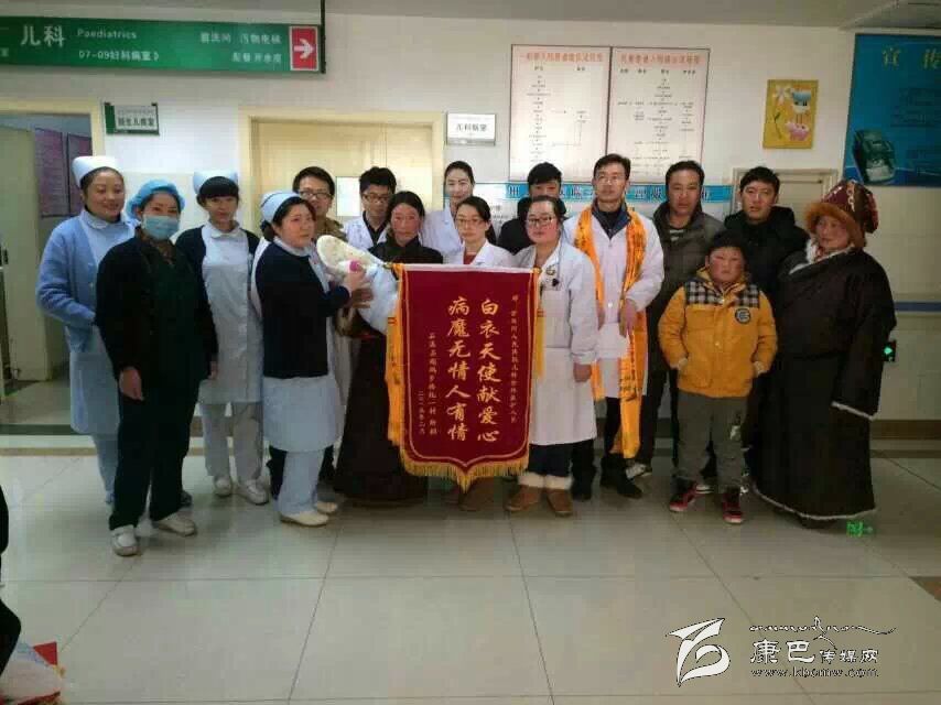 懷抱那胖乎乎、體重已經(jīng)增至2.9公斤的健康小寶寶,小家伙的母親雙眼流出了感激的淚花,她伸出大拇指,不停地“卡措、卡措(謝謝)”點(diǎn)頭致謝。為了表達(dá)感激之情,家人還特地送來了一面錦旗,上面印著“病魔無情人有情,白衣天使獻(xiàn)愛心”。