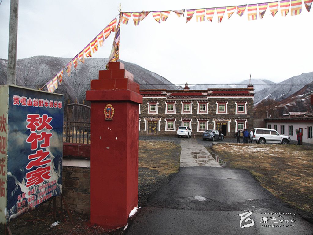在距鄉(xiāng)政府不遠(yuǎn)的營(yíng)九路邊上,有一個(gè)“貢嘎山越野車俱樂部·秋竹之家”的燈箱廣告。在雪山的映襯下,這個(gè)不大的燈箱廣告顯得格外引人注目。步入“秋竹之家”的大門,進(jìn)入眼簾的是一幢民族風(fēng)格濃郁的建筑,黑白紅三色相間的墻面,還沒有吐綠的院壩,所有的一切,都讓記者看不出這幢建筑與普通民居有什么不同的地方。