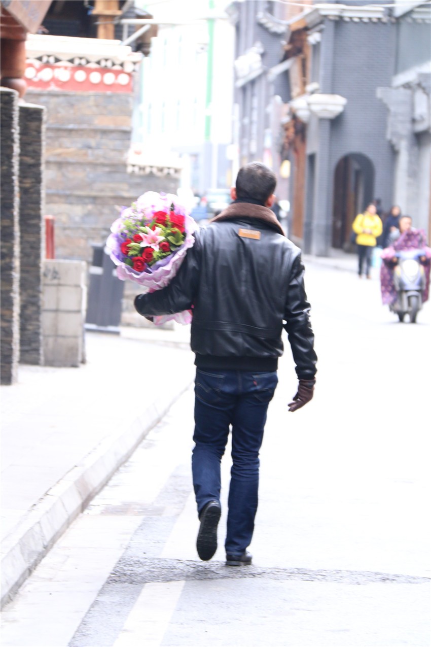 愛神阿佛洛狄特為了追尋情人阿多尼斯,在玫瑰花叢中奔跑,被花刺刺傷,白色的玫瑰花因其血液浸染從此變成紅色的故事,玫瑰便成了愛情的象征和傳情的首選信物。現(xiàn)在,用一束精心挑選的玫瑰向心愛的那個她表達濃烈、深沉的情意已是康定人過情人節(jié)的重要元素。微風中、花店里,那一束束繽紛燦爛的玫瑰,不僅承載著花店老板的經(jīng)濟收入,更承載著眾多男女的愛情收獲,儼然是最鮮明的節(jié)日符號。而玫瑰花必不可少的“搭檔”便是一張泣血陳“情”的賀卡,而寫賀卡最佳姿勢恐怕應該是單膝跪地。