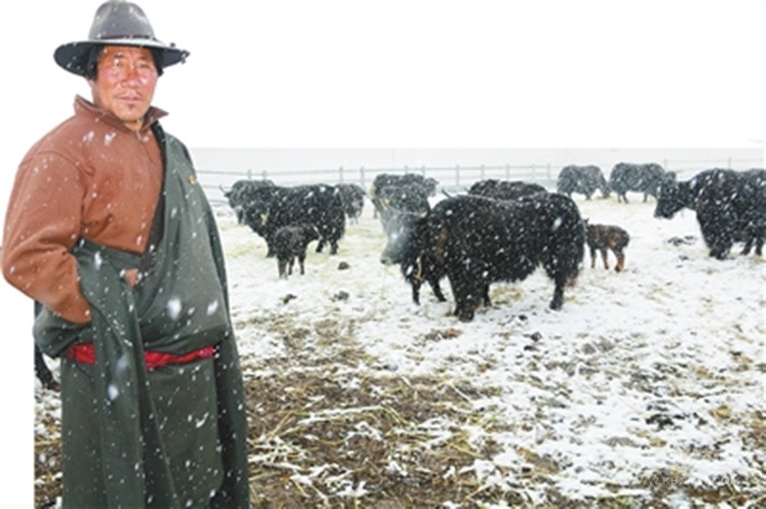 5月8日,甘孜縣達(dá)通瑪片區(qū)大雪飛揚(yáng)。在茶扎鄉(xiāng)銀多村集體牧場(chǎng),放養(yǎng)人員格絨正在給上百頭牦牛喂草料,他喜滋滋地說,通過牧民儲(chǔ)備和農(nóng)牧農(nóng)村局提供草料的方式,牦牛可以安全過冬。銀多村現(xiàn)代化集體牧場(chǎng)合作社成立一年多的時(shí)間,共出欄牦牛16頭,總收益67380元,除去20%預(yù)留金,村民有了一定的收入,而作為放牧人員,他管理了52頭牦牛,一年有1.2萬元的收入。