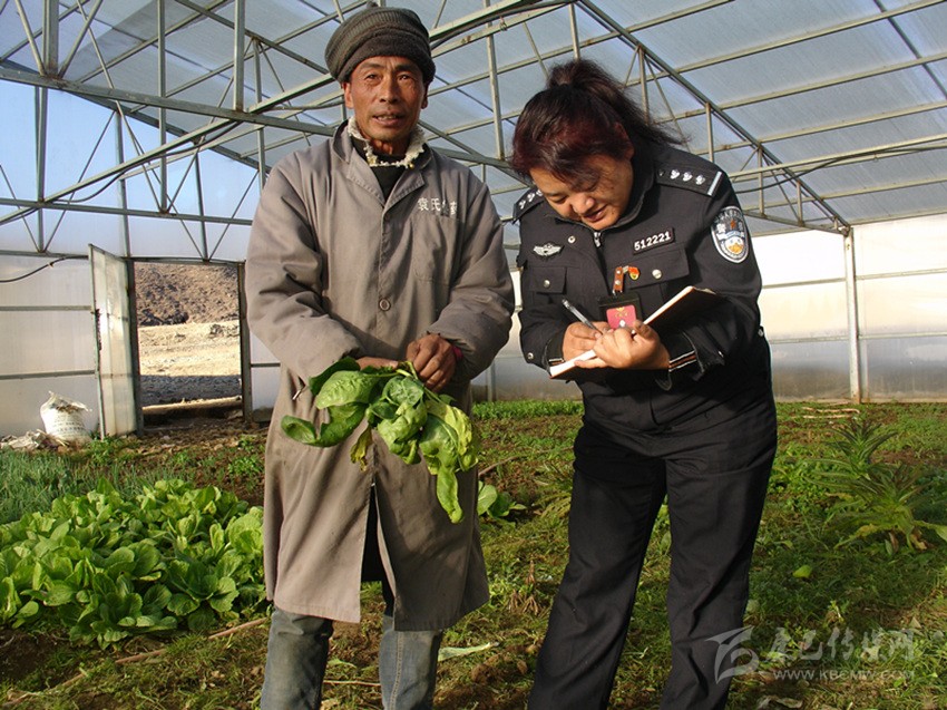 劉霞在大棚內(nèi)了解蔬菜長(zhǎng)勢(shì)。