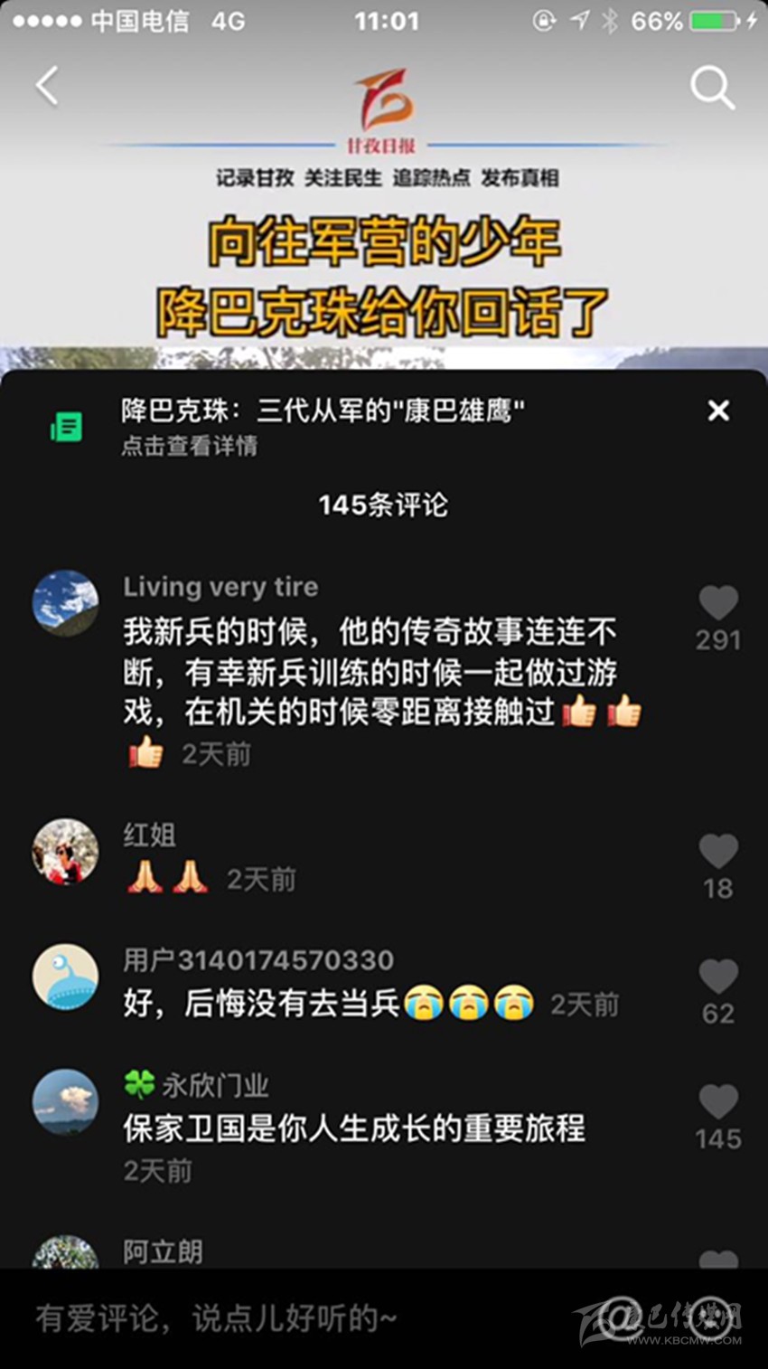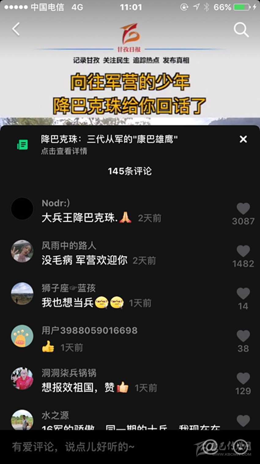 三段視頻,六百多條留言,近兩千萬次播放,一個藏族少年的軍旅夢在網絡上熱烈綻放,而農牧區(qū)許多青年的軍旅夢也就此被點燃,忠勇大愛的“血脈”在康巴高原傳承! (本網記者 肖宵 整理)