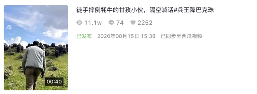 8月15日,一段時長30秒的視頻出現在抖音平臺中,郎卡扎西用并不標準的普通話向網友們介紹了自己,他趕著牦牛上山、摔倒牦牛、和朋友們打籃球的畫面依次展現,視頻最后他面對鏡頭再次說出了自己的心聲:“要成為像降巴克珠哥哥那樣的軍人!”