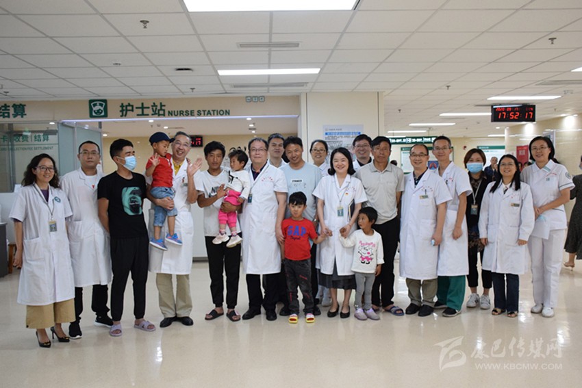 成都市第五人民醫(yī)院醫(yī)護人員與先心病小朋友、家屬合影。
