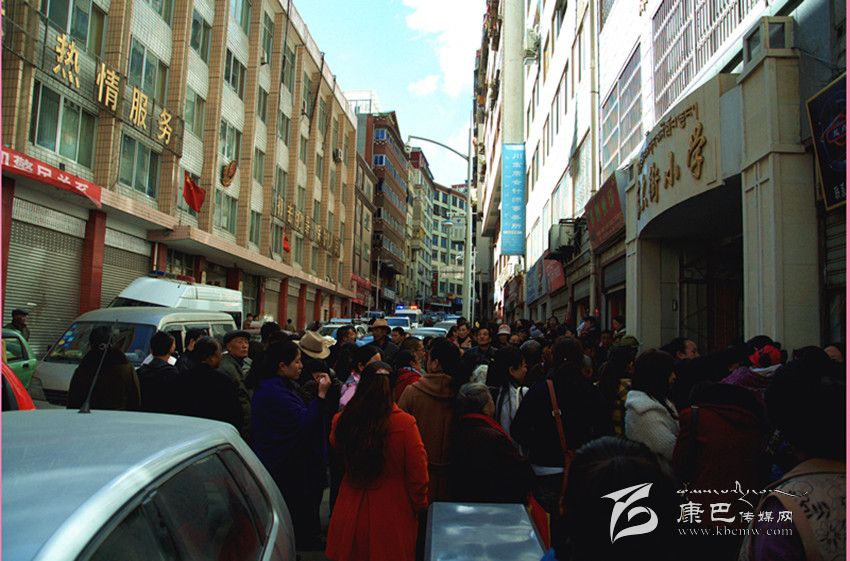 11月10日11時50分,記者趕到康定東大街小學(xué)門口,正是中午放學(xué)時間,一陣下課鈴聲響過之后,成百上千的學(xué)生魚貫而出,與等候在校門口的家長匯合。學(xué)生、家長的喧鬧聲和汽車?yán)嚷晠R集到一起,現(xiàn)場十分嘈雜。記者還沒走到校門口,就不得不走下人行道,在馬路上見縫插針地行走。因?yàn)闆]有專門的家屬等候區(qū)域,家長們已經(jīng)把公路占據(jù)了一大半,車輛只得緩慢行駛。記者發(fā)現(xiàn),由于路面本來就十分狹窄,幾乎沒有人行道,車輛和行人不分,交通狀況十分擁擠。
